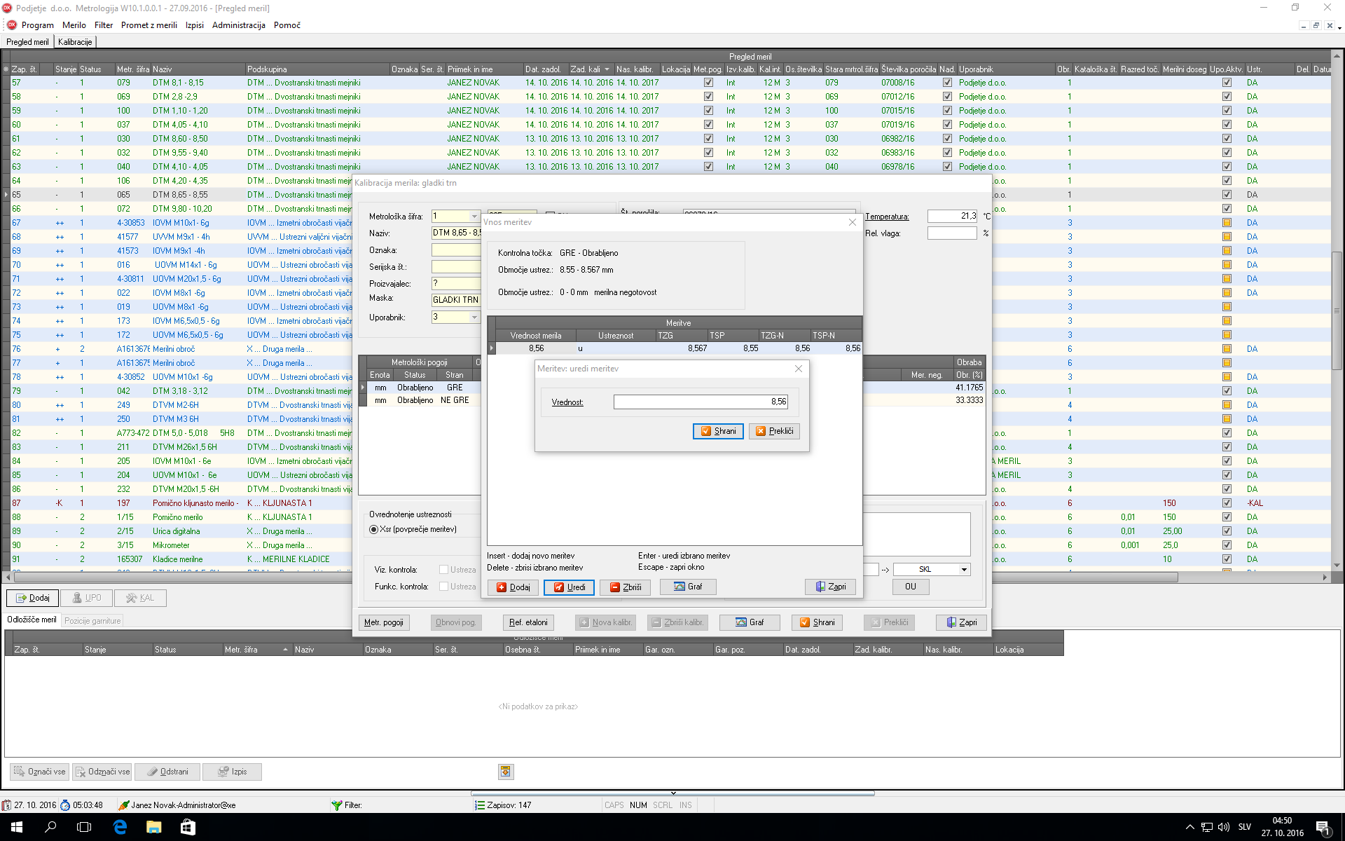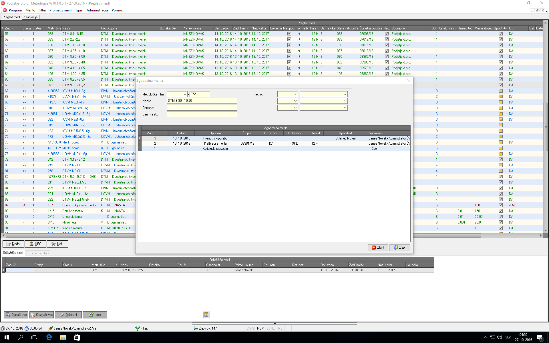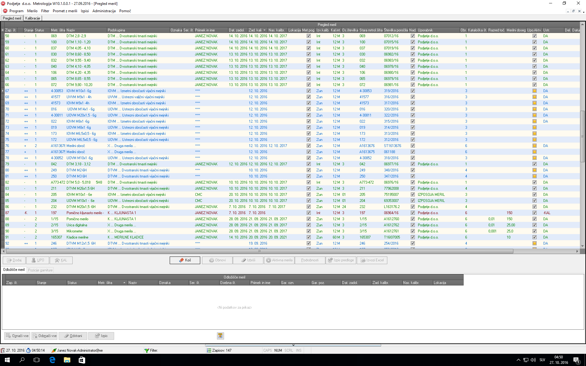 - Evidenčni list merila: prikazuje osnovne podatke o merilu ter pretekle kalibracije merila skupaj z ustreznostjo kalibracij.